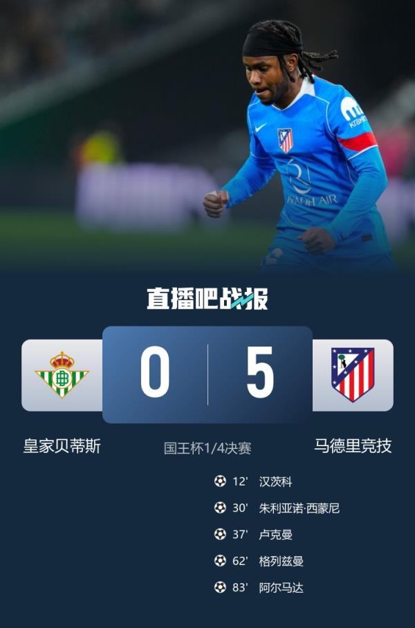 国王杯1/4决赛,马竞客场5-0大胜皇家贝蒂斯,卢克曼首秀传射,格列兹曼进球。