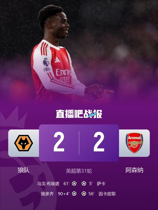 2025-26赛季英超联赛第31轮,阿森纳客场2-2遭狼队绝平,萨卡、因卡皮耶进球。