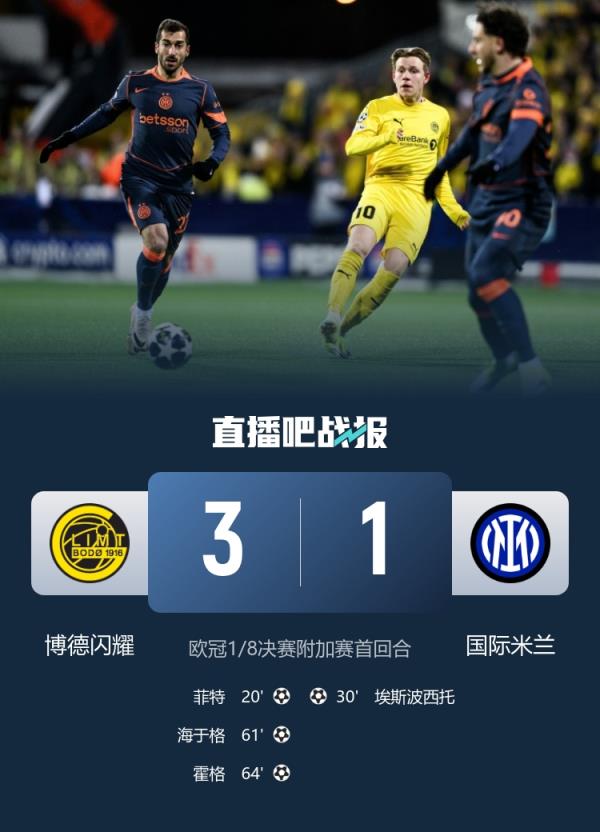 欧冠1/8决赛附加赛首回合,国米客场1-3不敌博德闪耀,埃斯波西托进球。